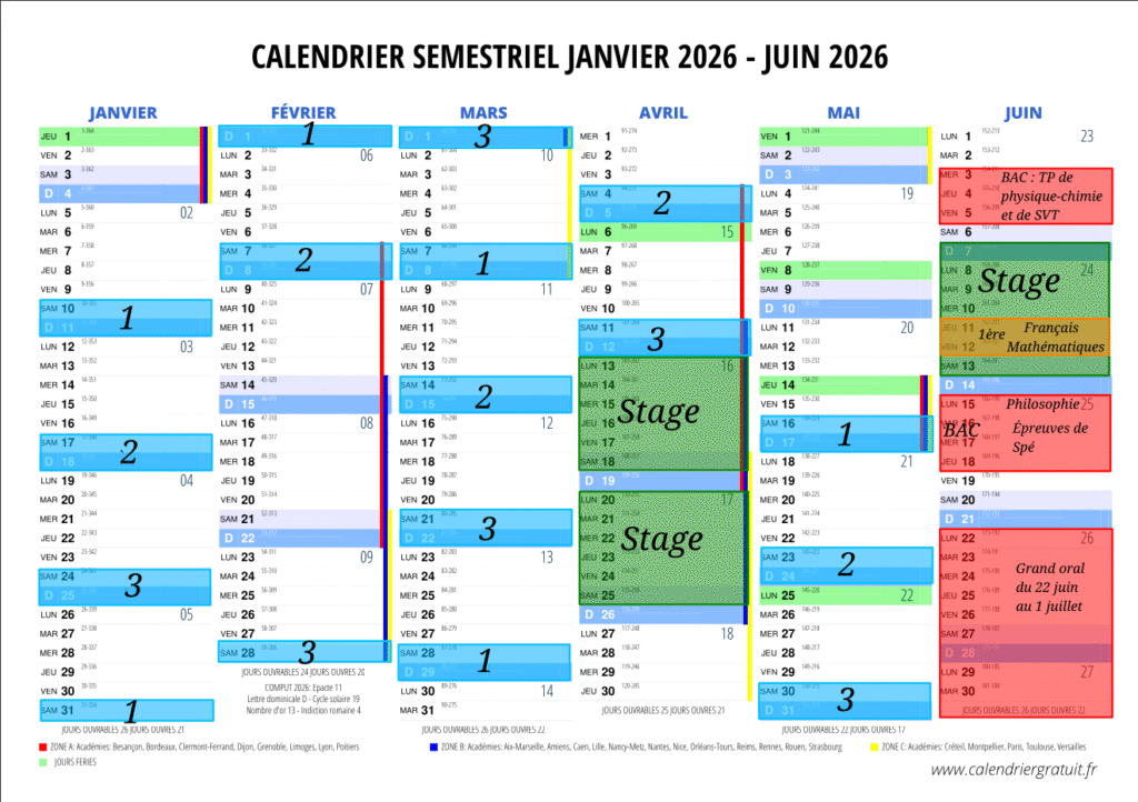 - En vert : les semaines de stages de vacances. Les plannings seront donnés en temps utile.