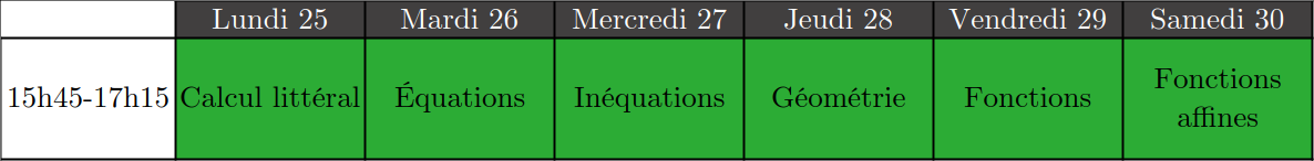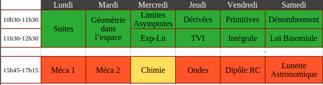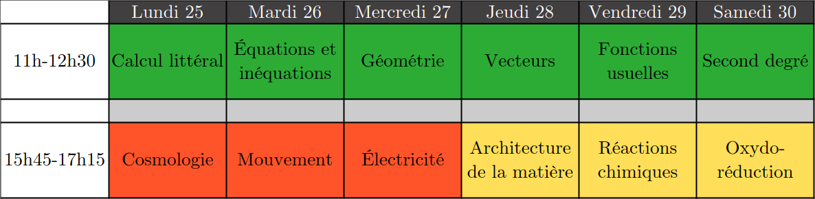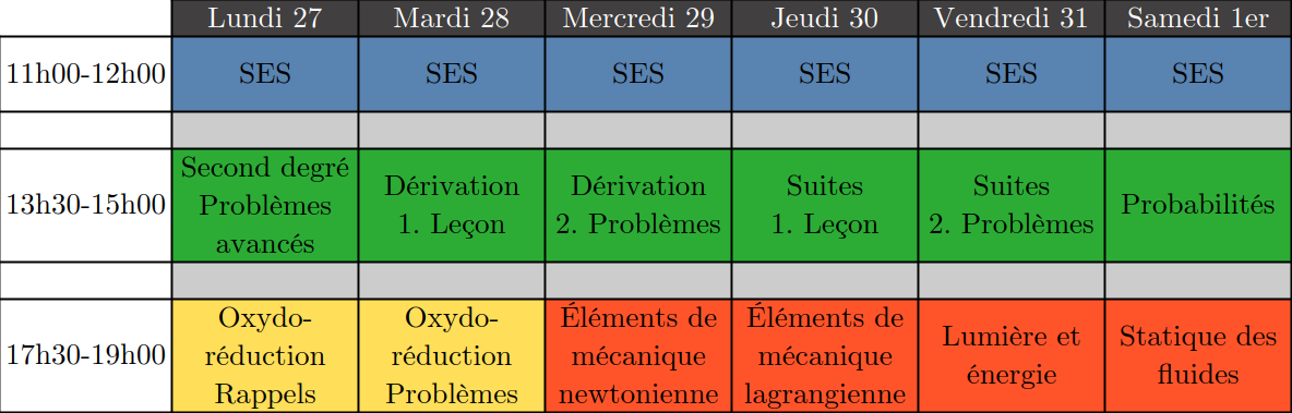 Voici les plannings, vous pouvez réserver la semaine entière ou à la carte. Pour se consacrer pleinement aux cours du stage, nous ne donnerons pas de cours particuliers durant cette période.